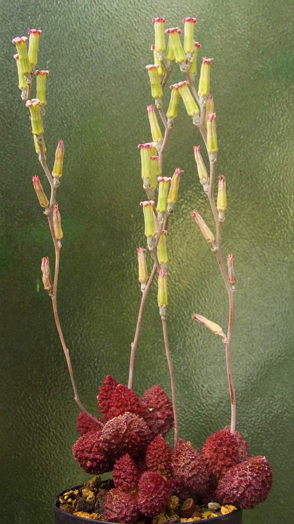 Adromischus marianiae var. herrei gehört zu den Crassulaceae und ist eine sehr schöne südafrikanische Sukkulente. Hier sieht man zunächst die ganze Pflanze mit ihren Blütenstielen ...
