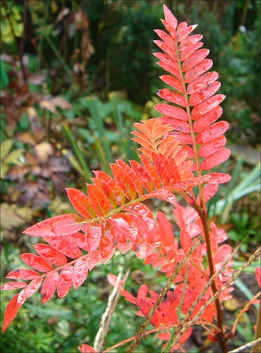 knallrote Färbung nur bei jungen Exemplaren oder nach Schneidearbeiten bei neuem Austrieb. Im NL Wikipedia steht, dass Quercus rubra in Amerika zusammen vorkommt mit Quercus alba, Ulmus americana, Pinus strobus, Carya ovata, Acer saccharum, Fraxinus americana, Liquidambar styraciflua und Liriodendron tulipifera. Das Laub des Tulpenbaums fiel mir heute auch sehr angenehm auf: überwiegend leuchtendgelb, dazwischen lebkuchenbraun eingestreut. :)Angehängt nun das Blütenbild eines Strauches, der nicht im Bärtels steht. Aber bei mir im Garten.