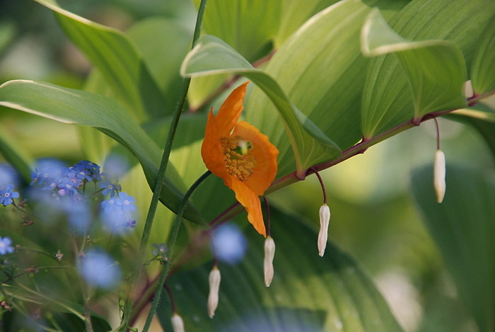 Und ich finde es praktisch, weil man dann gleich die Besitzer fragen kann, was das ist und wie es wächst usw.Polygonatum (Art fällt mir nicht ein) 'Variegatum' mit Meconopsis cambrica und Brunnera macrophylla.