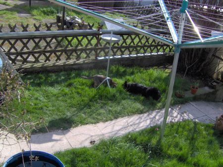 Der Rasen muß schon gemäht werden.Diese beiden verspeisen gemeinsam eine Maus, die die Katze gefangen hat. Heute ist es deutlich kälter und trüber.