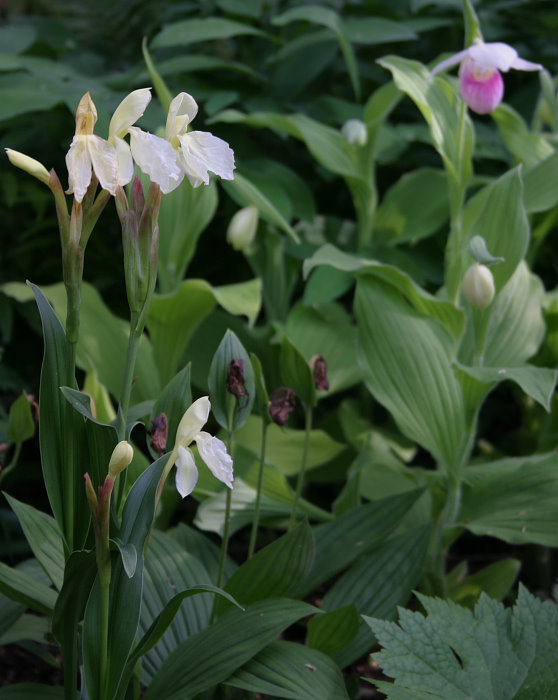 roscoea cautleoides 'jeffry thomas' blüht vor der eigentlichen art mit weißlichen blüten. hier in kombination mit den ebenfalls zu blühen beginnenden cypripedium reginae. alle pflanzen stehen in reinem bims, der zwischenzeitlich in der oberen schicht ordentlich humusiert ist.