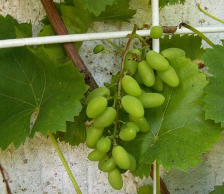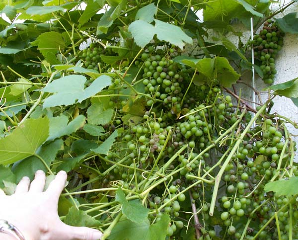 So eine Sortenbestimmung ist schwieriger als gedacht! Falls ich nochmal eine Rebe pflanze, wird es auf jeden Fall eine frühreifende und resistente Sorte sein. Die besten Wandseiten sind aber schon vergeben. Links neben meiner geposteten Rebe steht noch eine. Die ist aber erst 2 Jahre alt und noch (!) gesund. Auch hier weiß ich die Sorte nicht, ist aber nicht meine Schuld, meine Mutter hat sie bei einem (eher berüchtigten) Gartenversand bestellt. Sie hat deutlich später geblüht - so 2 Wochen - als die andere und ich fürchte, daß sie nicht ausreift.Deshalb noch eine Frage: Muß man davon ausgehen, daß später blühende Sorten auch später ausreifen?Ein Bild hab ich auch noch, war fotografierwütig heute