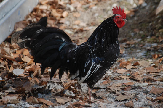 Da hast du Recht. Seine unregelmässigen Punkte und das blaue Schimmern fügt sich zu einem verwegenem Ganzen zusammen. Und seine unbefiederten Beine lassen ihn schlank und leichtfüßig wirken. Im Vergleich zu den anderen Hähnen ist er auch viel leichter. Trotzdem hat er sich mindestens eine Henne gesichert, die er herumführt und der er Leckerbissen zeigt.