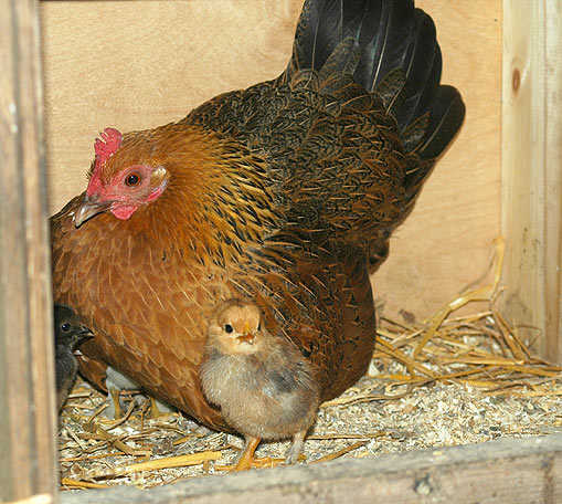 ...und diese Glucke hat mit einer anderen zusammen 6 Küken, die zusammen gepflegt werden. Auch witzig, oder?Eine Glucke hatte nur ein Einzelkind - ist aber schon 3 Wochen alt und selten zu finden, schläft schon auf der Stange.Eine sitzt noch mit 10 Eiern.... Also ist der Winter ( mit Hähnchenbrust