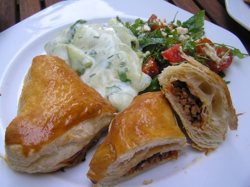 sodele, hier das bild.blätterteigtaschen mit hackfleischfüllung, dazu gurkensalat, tomaten-schafskäsesalat mit basilikum und kresse.