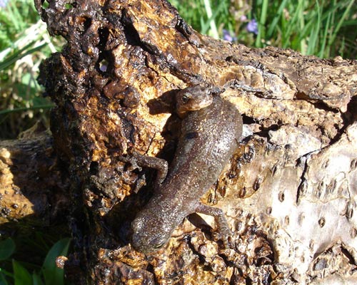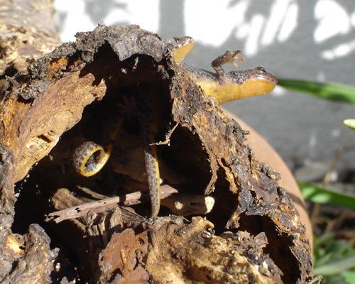 Heute habe ich ein Molchwinterquartier entdeckt! In einem ausgehöhlten Stamm eines Marillenbaumes waren sie gerade am Auftauen.
