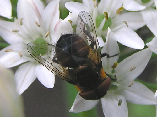 Danke Ingrid, mit deinem Hinweis habe ich ein wenig die Literatur gesichtet.Als wichtigstes Erkennungsmerkmal der Tachiniden wird die reiche Körperbeborstung angegeben. Als weiteres Kennzeichen ein „deutlich ausgeprägter und vorgewölbter Querwulst unter den Schildchen… (sowie)… die gewinkelte Spitzenquerader.“ Die ist, glaube ich, in der Vergrößerung zu erkennen. Nahrungsspender ist übrigens die Blüte des Schnittknoblauchs.ich würde Deine Fliege zur Familie Tachinidae, Schmarotzerfliegen stellen.