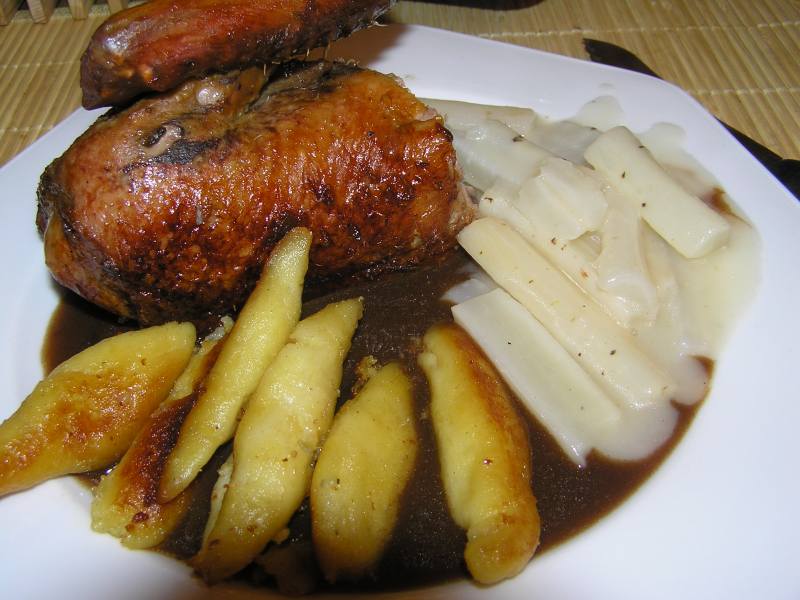 Heute gab's Deutsch-Angus-Rinderbraten mit Knödeln und Kopfsalat. Hinterher zur Stärkung der Abwehrkräfte wieder Obstsalat aus Äpfeln und Bananen. Diesmal habe ich die Innerei einer Kiwano zusammen mit ein paar Brombeeren gekocht und durch ein Sieb gerührt. Das kam dann an den Salat + Orangeat, Limettensaft und Ahornsirup. Leider werden meine Essensbilder meistens unscharf, für das Hauptgericht wollte ich auch einen anderen Teller nehmen, hatte es dann aber schon auf dem mit Macke