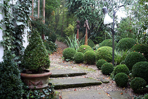 Da ich in letzter Zeit relativ viel unterschiedliche Gärten ablichte, möchte ich auch noch meinen Beitrag zu diesem Thema leisten. Also... ich für meinen Teil unterscheide sehr wohl zwischen einem Gartenraum und einer Beetansicht. Vielleicht sieht das jedoch ein reiner Fotograf anders. Wenn ich als Gärtnerin von einem Gartenraum spreche, meine ich damit ein Gartenzimmer, also etwas Räumliches mit meist zwei bis drei Eingrenzungen/Einfriedungen an den Randbereichen, einem Durchgang/Tor oder ähnlichem. Zu den Beetansichten zähle ich auch Pflanzenkombinationen, wobei Beetansicht einen weitläufigeren, größeren Bereich darstellt. Beetansichten sind nach meinem Ermessen wesentlich leichter abzulichten, wie Gartenräume. Gartenräume wirken erst gut auf den Betrachter, wenn darin ein ruhiger Pol vorhanden ist, wie ein Stück Rasen, ein strenge Buchseinfassung, eine große Amphore, ein Mauerwerk, eine Sitzgelegenheit oder sonst etwas, an dem sich das Auge festhalten bzw. ausruhen kann. Ein Weg, der sich hindurchschlängelt, stellt ebenfalls einen ruhigen Pol dar.Wie gesagt, meine Meinung ist nicht der Weißheit letzter Schluß, aber so empfinde ich es.Folgendes Bild ist nicht bei mir im Garten aufgenommen und stammt noch aus meiner Powershot-Zeit. Ich finde die Bildaufteilung jedoch nach meinem Empfinden recht gelungen. Vorne links der Topf im Vordergrund stellt einen Gegenpol zu den eher diagonal verlaufenen Buchskugeln dar (übrigens hat der Buchspilz auch in diesen Garten Einzug gehalten.... es ist ein Jammer). Der sich schlängelnde, diagonal verlaufende Weg leitet das Auge durch dieses Gartenzimmer, führt es hindurch.Anmerken möchte ich noch, dass gestylte Buchsgärten und architektonische Gärten zig Mal leichter zu fotografieren sind, als wilde Naturgärten. So schön Naturgärten in der Realität auf mich wirken, so konfus wirken sie auf dem Foto. Ich darf das hier sagen, weil ich selber seit meinem Buchsdesaster wieder eine Wildnis zuhause habe, die ich immer mehr liebe, aber schlecht ablichten kann. Hoffentlich hab ich jetzt nicht zu viel geredet. Hier das Foto: