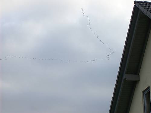 Wir haben beobachtet, wie sich diese Trupps in die V-Ketten eingereiht haben. Das V hatte nach links hin deutlich Schlagseite: etwa mehrere 100 m Länge gegen vielleicht 20 m rechts. Ich hätte gerne noch gesehen, ob sie sich da auch noch mal umgruppieren, aber sie sind zu schnell geflogen, so dass sie trotz der riesengroßen Truppenstärke auch nach wenigen Minuten vorbeigezogen waren.