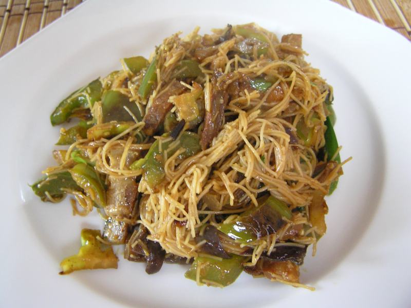 wir hatten zweifach gegartes schwein asiatisch mit sojabohnenpaste, grünem gemüse, chinesischen pilzen und glasnudeln.nicht hübsch aber lecker.