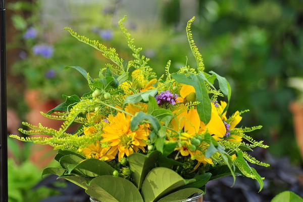 Für einen Familiengeburtstag wollte ich heute einen Strauß schneiden und musste feststellen, dass der Garten das nicht mehr hergibt. In meiner Verzweiflung habe ich einen alten Steckschaum-Kranz mit den wenigen verfügbaren Blüten und viel Grünzeug bestückt: Epimedium, Efeu, Artemisia `Valerie Finnis´, Lonicera `Red Tips´, Gaillardia, Sedum `Purple Emperor´, Hydrangea `Limelight´ und Allium flavum.