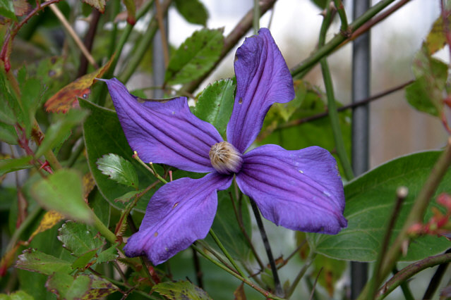 Letzte Woche blühte bei mir noch "Blue Belle". Sie ist immer die die letzte, die noch tapfer ein bisschen Farbe in die Clematis-Ecke bringt.