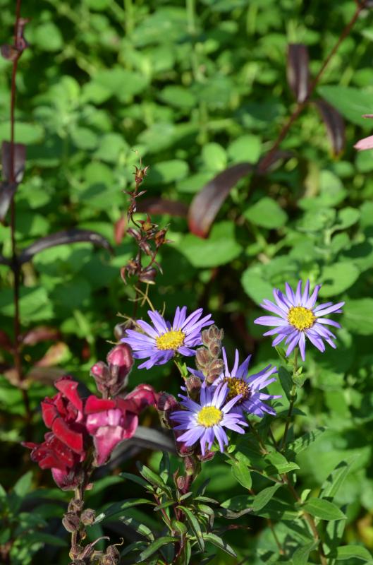 Jule, ich denke ebenfalls, dass Du dort nur etwas höheres als Übergang zwischen Geranium und Astern brauchst. Gelb fände ich zu schrill an der Stelle. Wenn Du die Asternblütezeit verlängern willst: 'Purple Dome' hätte die richtige Höhe und macht perfekte halbkugelig Büsche. :) Sie beginnt hier gerade die ersten Knospen zu öffnen. Dazu paar Gräser, Hosta...