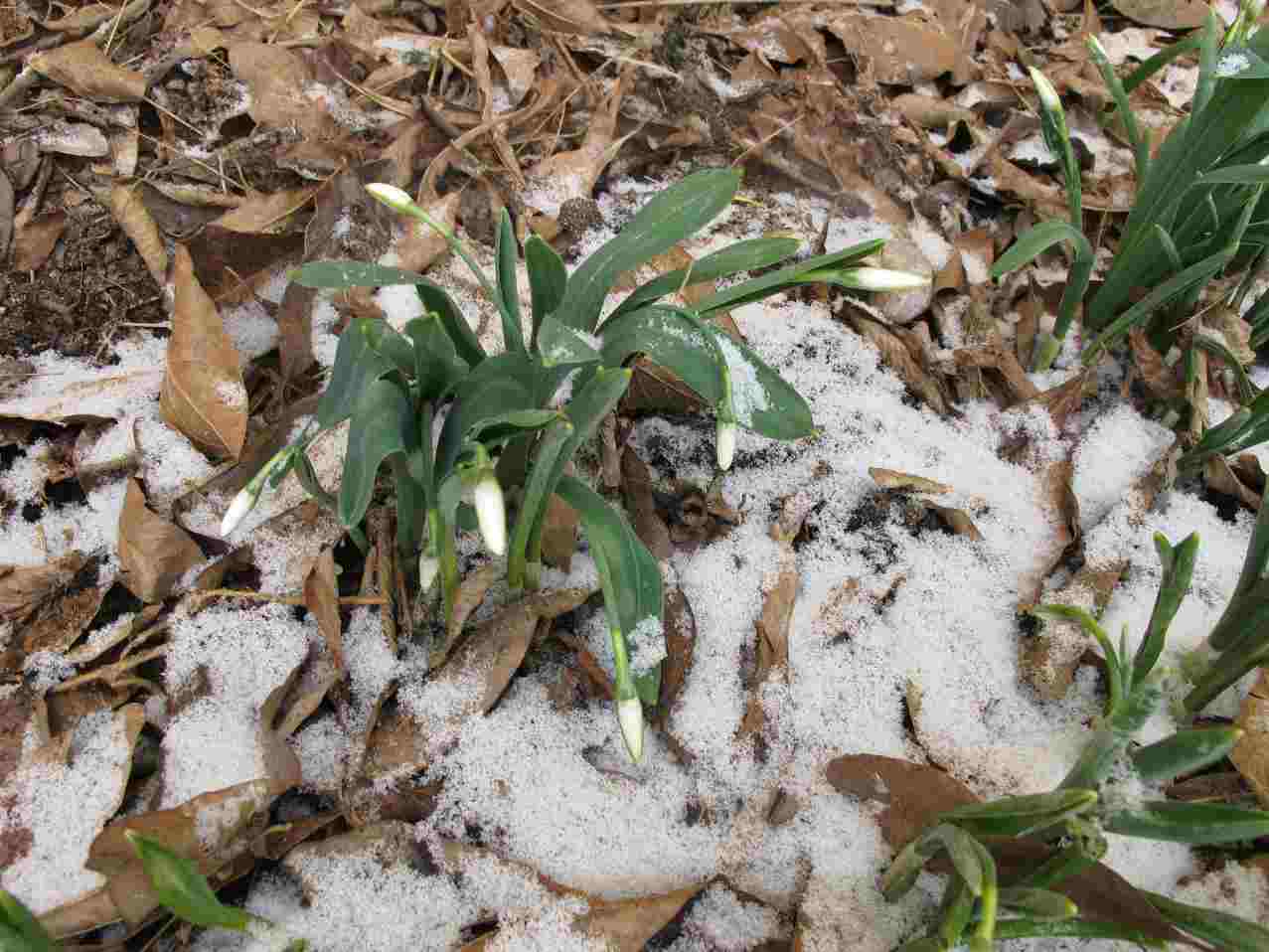 Der Schnee ist nach dem Tauwetter jetzt völlig hart vereist, es hat wieder geschneit, aber die Schneeglöckchen stehen ihren Mann.