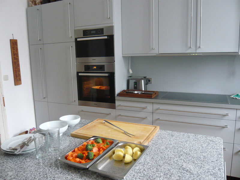 Nun will ich mich auch noch einmal melden. Ja es sollte eine Traumküche werden und es ist uns glaube ich geglückt. Sie ist in L Form aufgebaut mit einer großen Mittelinsel zum Einfüllen der Speisen in Schüsseln und Schalen und nach dem Essen zum Abstellen des gebrauchten Geschirrs. Eine Granitplatte hat nur die Mittelinsel bei den anderen Arbeitsplatten haben wir aus verschiedenen Gründen bewußt darauf verzichtet. Wie immer bei Küchenaufbauten ist unsere Küche zwar funktionsfähig, aber es fehlt noch dies und das was nachgeliefert wird.Zum Thema Sauerbraten muß ich sagen, dass ich ihn auch nur ein bis zwei mal bisher gegessen habe aber nachdem ich nun so ein gutes Rezept von tzara habe, könnte man es mal versuchen.Die Steckdosen sind mit einer echten V2A Edelstahlabdeckung von der Fa. Busch Jäger und Kosten pro Doppelsteckdose ca. 33,00 EUROHier noch einmal ein Bild von der Mittelinsel mit zum Dampfgaren vorbereitetem Gemüse und Kartoffeln