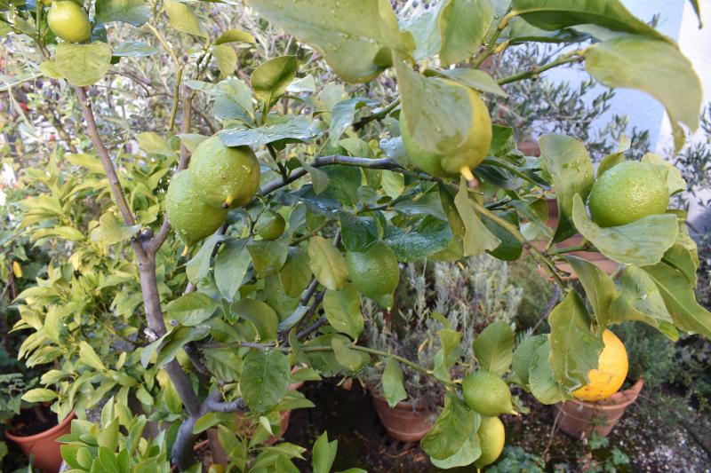 Übrigens habe ich die Hashimoto auf Carrizo vorletzten Winter mal für 2 Tage/Nächte verrgessen, sodaß sie versehentlich Nachttemperaturen von -5,5 °C bei darüber hinaus bestehenden Tagfrösten ausgesetzt war (damals noch im ca. 8L-Topf und nicht wie jetzt im ca. 15L-Topf), d.h., der Topf war komplett durchgefroren. Sie sah danach arg gebeutelt aus, aber wie man sehen kann, hat sie sich gut erholt, denn die gezeigte Frucht stammt von ihr.