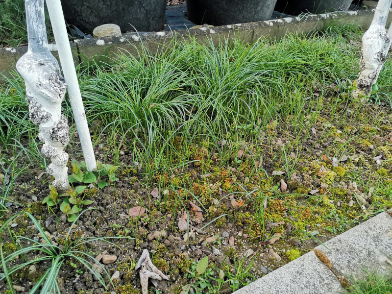 Prinzipiell könnte man das Laub jetzt wegpusten, ich habe nur keinen Puster. Und Bodenbewegung ist tabu, wegen dem Unkraut.