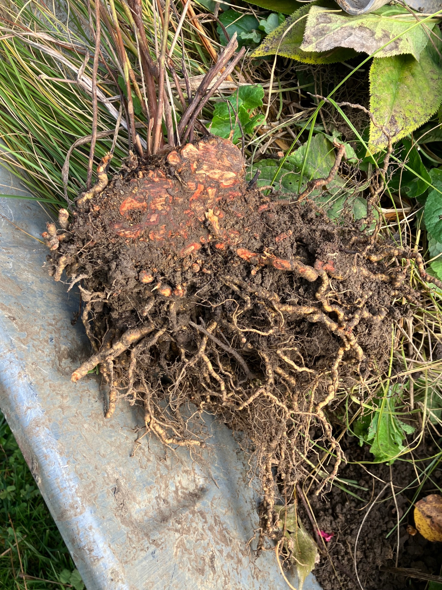 "Der Wurzelstock einer Gillenia ist bockelhart, wie verholzt.." (aus dem Artikel). Sie hatte einen sehr dicken Strunk, dem nur mit der Säge beizukommen war. Er schreibt, beste Zeit zum Teilen Frühling. Ich hoffe, das geht jetzt im Herbst auch gut aus. (Und dass sie nicht zu lange beleidigt ist.)