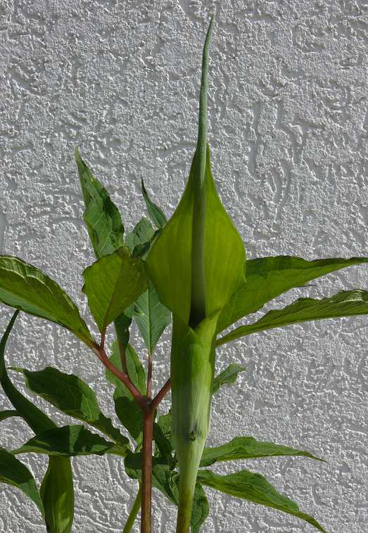 Ich kann die Leute verstehen, die auf diese Stinker abfahren. Meine Erfolge sind eher durchwachsen. Zwar hatte ich jahrelang einen schönen A. fargesii auf dem Balkon, der aber im letzten Winter bis auf eine Brutknolle verfault ist. Diese schiebt immerhin ihr breites Blatt, und ich werde in Zukunft besser aufpassen.Beim zweiten Arisaema habe ich mehr Glück gehabt. A. tortuosum ist mit mit seiner Blatthöhe von über 1,5 m zuerst in Wakehurst Place aufgefallen. Ein netter Gärtner eines Botanischen Gartens hat mir dann ein paar kleine Knollen geschenkt, von denen momentan 2 blühen.:)Michael