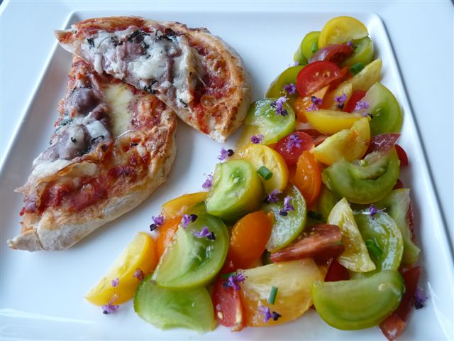 ;Dzum Glück kam der heutige Mittag, es gab eine sehr kleine Pizza (ich hatte nur noch dieses kleine Stückchen Teig) mit bunten TomatenTomaten: Green Pineapple, David, Solotoi Rybka, Goldita, Karo, Zitronentomate
