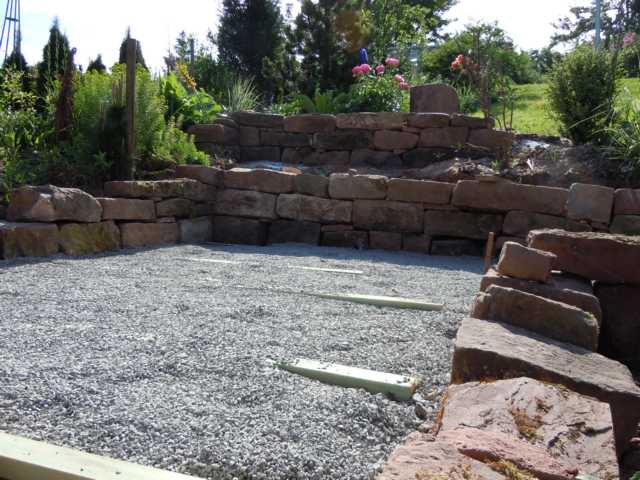 So, ich bin etwas weitergekommen mit dem Senksitzplatz.Jetzt müssen nur noch einfache graue Betonplatten drauf. Wäre schon passiert, wenn nicht der Splitt ausgegangen wär.