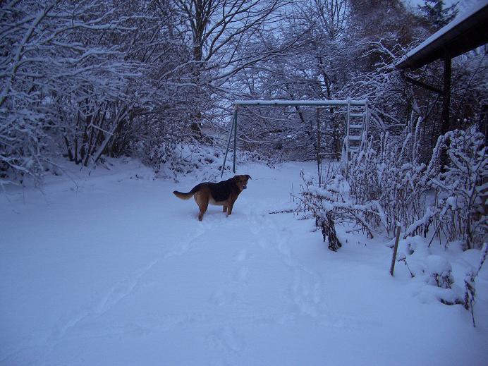 Nelly freut sich besonders über Schnee. Leider begreift sie den Zusammenhang zwischen Schnee-Fressen und Bauchwehkriegen nicht so ganz