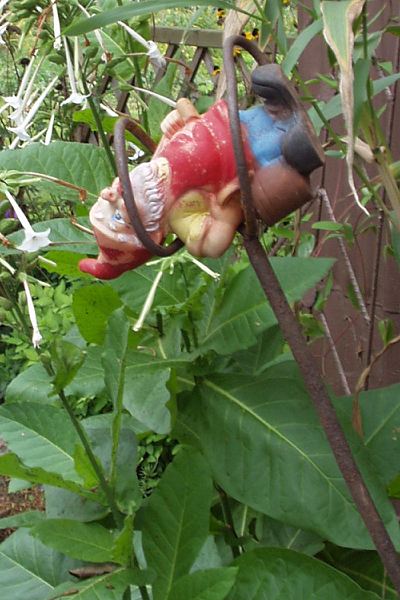 Nachdem mir ein Eisenteil in T-Form, nur ein Stückchen aus der Wiese ragend,im Sommer fast das Mähwerk zerschlagen hat, habe ich es nun mal ausgegraben und einen Stein darin eingewickelt.Danke für die gute Idee, Wigbert! Sieht jetzt aus wie ein Steinbockund paßt gut ins Beet.