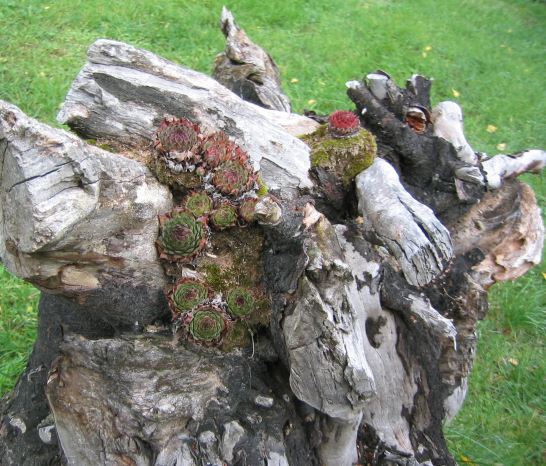 Das war mal eine Mandel, mehr als 10 Meter hoch und schwer monilageschädigt. Die Schwester habe ich schon vor einigen Jahren aus dem Boden gehebelt und ihr dieses Jahr einige Hauswurze in die Falten gesteckt - vielleicht wächst ihr ja ein Pelz.