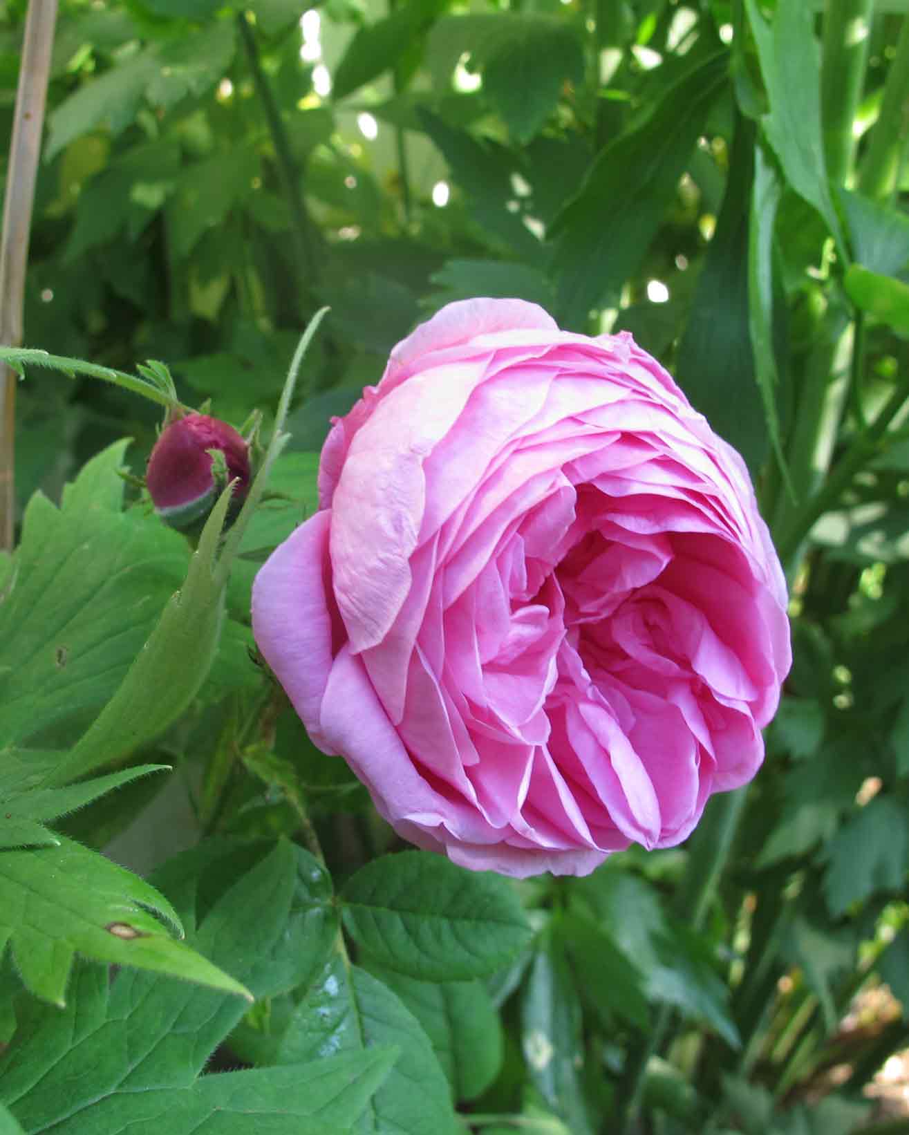 Und Louis(e) Bugnet: Ich hatte sie hier schon früher erwähnt. War auch praktisch nie ohne Blüten und schiebt immer noch Knospen nach, und das an der Nordseite, Sonne erst ab Nachmittag. Duft und besonders schönes Laub an roten Trieben
