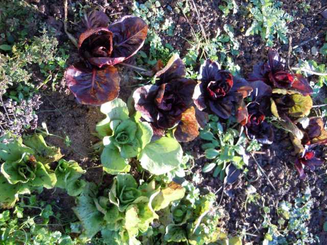 18. Januar:Zichorien im Freiland: links: Variegata di Castelfranco, rechts: Grumolo rosso.