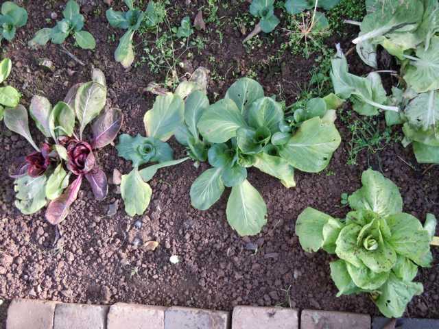 Gleiche Sorten im Tomatenhaus. Auffällig ist ,dass die rote Farbe dort nicht so stark ausgebildet ist.Links: Grumolo rossomitte: Grumolo verderechts: Variegata di CastelfrancoRichtig viel dran ist nicht. Die Rosetten haben etwa 15 cm Durchmesser. Schmecken aber gut