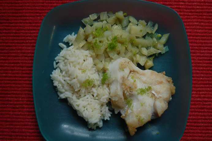 Es gab Kabeljau mit Reis und Fenchelgemüse.