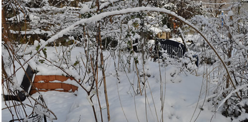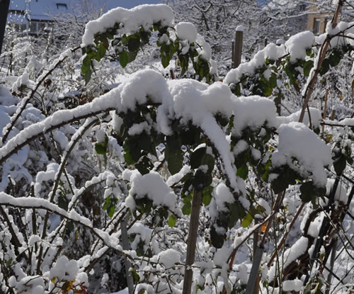 Albertine baute gleich einen ganzen Unterschlupf. Eigentlich sollte sie ja ganz schön und klar am Pfahl links hängen, der Winter ist aber zu früh gekommen.