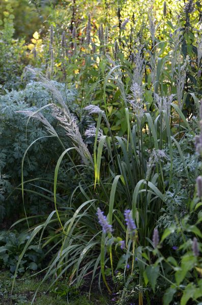 Mein neues Lieblingsgras ist Calamagrostis spec. Korea von Sarastro. Es hat viel breitere Halme als C. brachytricha und steht nicht so straff aufrecht, sondern hängt elegant über. Die Blüten sind dazu blau bereift. Eine große Pflanze davon muss beeindruckend sein! (habe schon in Gedanken Plätze für weitere freigegraben)