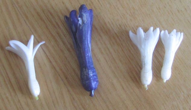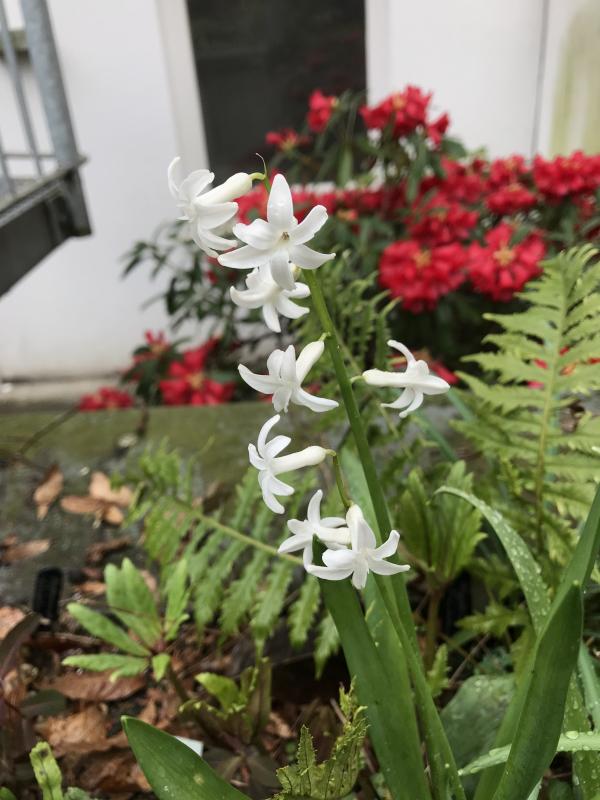 Die weißen wilden blühen wieder. Auch alle die ich von Moreno bekommen habe, vielen vielen Dank nochmal.Morenos haben 3 Wochen früher das Laub geschoben. Dieses ist im Augenblick 2-3x so kräftig und hoch wie das meiner Zwerge. Der Blüptenstand doppelt so groß. Die Einzelblütengröße ist aber weitgehend gleich. Bei mir gibt es viele zierlichere Ausreißer.Mal sehen ob sich das noch egalisiert in den nächsten Jahren.Ich habe noch degenerierte normale im Schrebergarten. So 5 Blüten am schütteren Blütenstand. Diese Blüten sind zwar noch nicht ganz offen aber riesig im Verhältnis.For Moreno your Hyacinths are already flowering. A thousand thanks. They were 3 weeks earlier in leaf than mine, but mine are now in flower too. Opening of the flowers was just a day apart. The leafs are much bigger, than the ones of my type. The flower is the same size. Maybe this will alter with time here. The whole plant looks much stronger and vigorous.For comparison fom left to right. Yours, a ordinary cultivar (which stood for decades here in the garden) and mine . It had only 5 flowers on one spike.