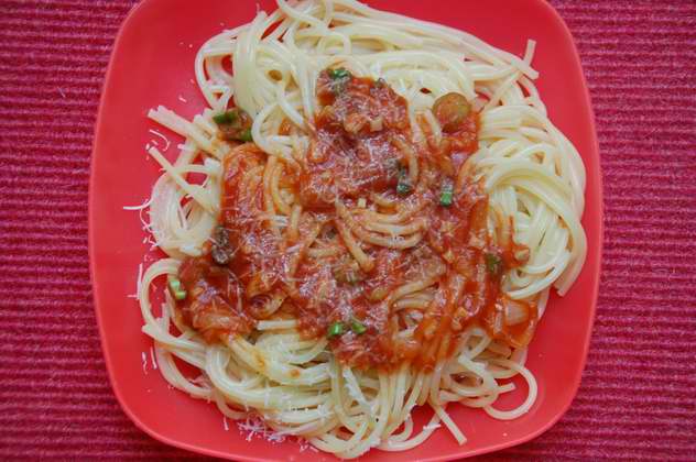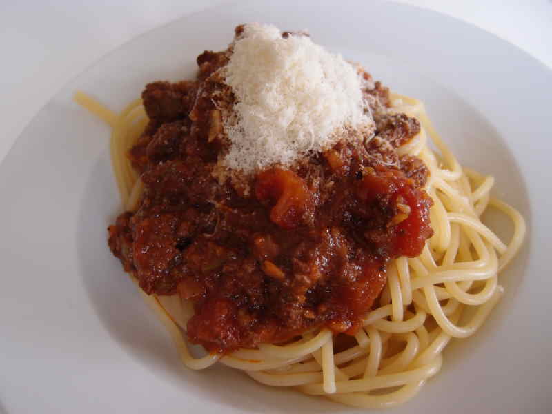 Spaghetti mit Tomaten-Knoblauch-Soße und Parmesan.