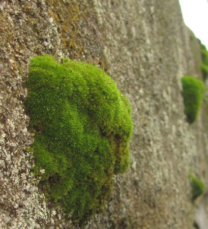 Diese Dachpolster auf eine neue Stelle setzen, falls sie mal runterfallen ist jetzt ziemlich leicht.Diese Knollen habe ich heute an einer verputzten alten Mauer gesehen. Da lassen sie die Amseln in Ruhe. Ich habe sie natürlich auch in Ruhe gelassen.Die Mauerraute Asplenium ruta-muraria die dort in allen Ritzen wächst hat keins der Moospolster besiedelt.