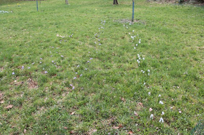 Hier ein Bild von zwei Reihen Chinondoxa/Scilla und einer Reihe Puschkinia. Im Herbst hatte ich mir gedacht, dass ich sie absichtlich in Reihen setze, damit ich leichter die Ausbreitung der verschiedenen Arten beobachten kann.