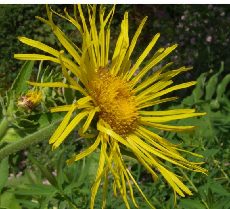 Der Alant, Inula helenium, ist auch wieder so eine Staude, die an unterschiedlichen Standorten wachsen kann: dieser bei uns als Kulturrelikt eingebürgerte Riese kann sowohl sonnig in Hochstaudenfluren an Ufern als auch halbschattig im lichten Gebüsch stehen - nur genug zu futtern muß er haben. Er wird bis zu 1,80 m hoch, ist dabei aber standfest. Die grundständigen Riesenblätter brauchen aber viel Platz!