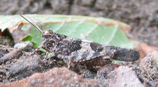 Haben wir hier eigentlich schon die Ödlandschrecke? Diese Tierchen kommen in meinem Garten sehr häufig vor. Sie lassen sich wegen ihrer Tarnung sehr schlecht fotografieren. Und was man überhaupt nicht aufs Bild kriegt sind die himmelblauen Flügel, die sie beim Springen ausbreiten.