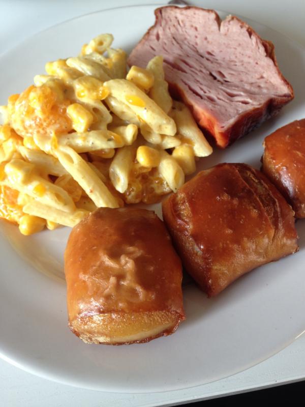 Nach einem herrlichen Gartentag gabs Fleischkäse, Nudelsalat und aufgebackene Laugenminis