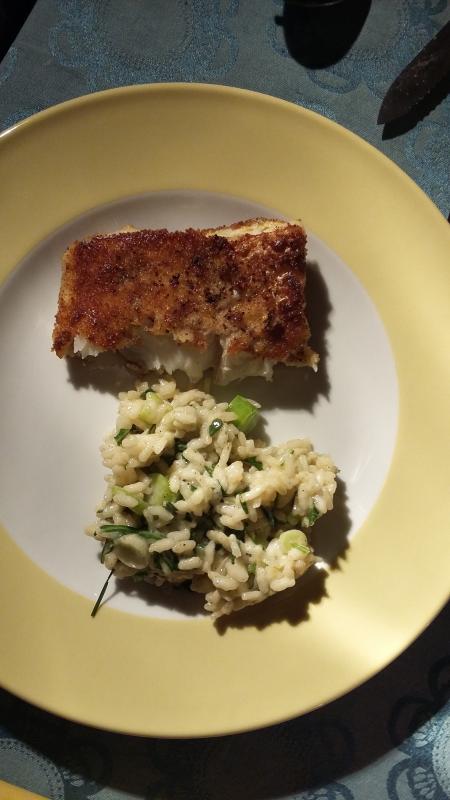 Gebratener Kabeljau und Risotto mit Frühlingszwiebeln und Rauke.
