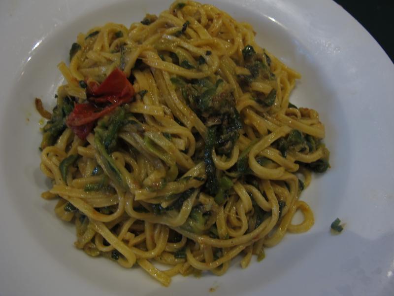 Nach Waldviertler Kost am WE gab es heute frische Tagliatelle mit gespitzten Zuccininudeln, kleinen angebratenen und in einem Schuß Hühnersuppe kurz reduzierten Tomaten, Stück frischer Butter, Basilikum, frischem Pfeffer und Parmesan.