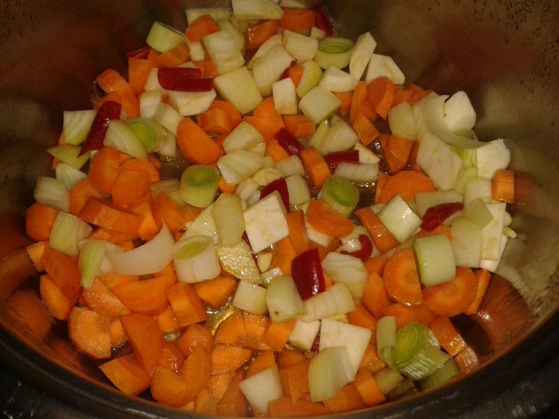 hier das Gemüse, das Geschmack in die Soße bringen soll (Möhren, Sellerie, Zwiebeln, Knobi, Porree, eine Chili)