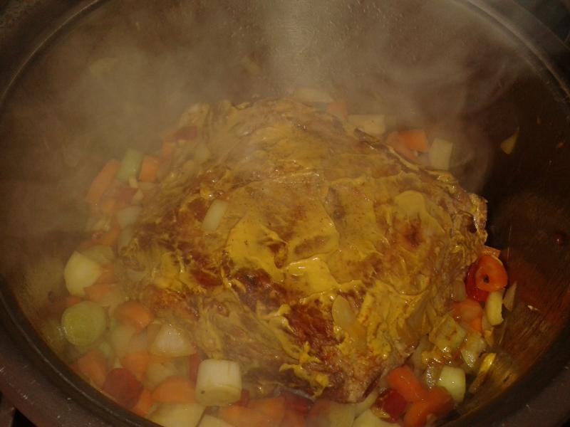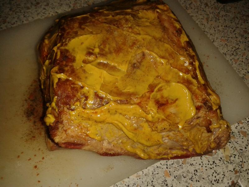Fleisch in Schweineschmalz angebraten, dann gewürzt und mit Senf bestrichen
