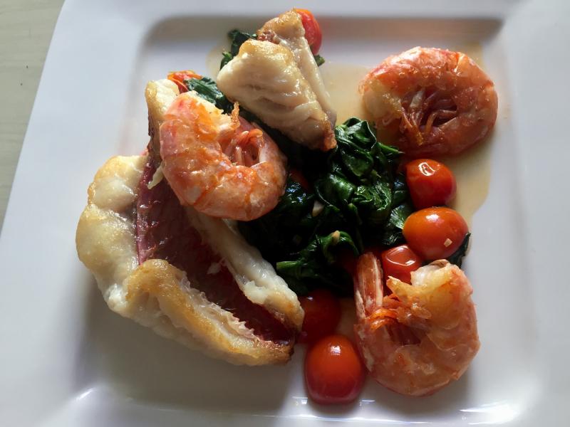 hier ein schnelles mittagessen: rotbarbe und garnelen auf blattspinat