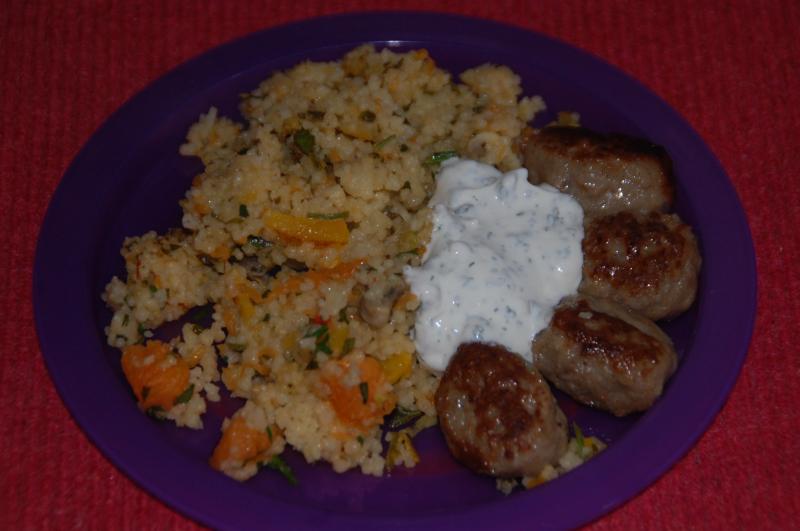 Heute Mittag gab es buntes Couscous (mit Chilipaste, Paprika, Champignons, Zwiebel, frischen Chilis, Petersilie, Zitronensaft und -abrieb, Kürbis) mit Bulettchen und Sour Creme.