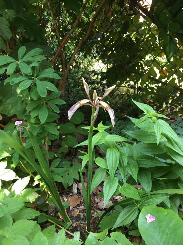 An der vorderen Ecke (hinter dem Stein), an der Ecke unter der Arizonazypresse (die kam auch einem Topf von z.H.) und an der nächsten Wegecke (vor dem Stein) habe ich Iris f.-Fächer gepflanzt. Am Anfang wurden die Blätter dürr, jetzt sind die nächsten grün.