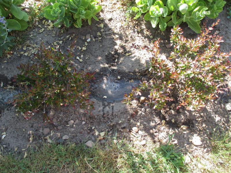 Um dem entgegen zu wirken forme ich Gießränder. Manchmal reicht das aber nicht aus, wie etwa bei dieser kleinen Hecke aus schwachwüchsiger Berberis, die ich im letzten Herbst gepflanzt habe.